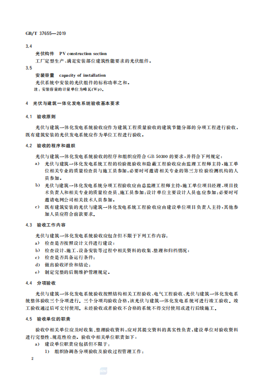标准规定了光伏与建筑一体化发电系统验收的术语和定义,验收的基本要求,以及结构相关工程验收、电气工程验收、系统整体验收等分项验收的内容。