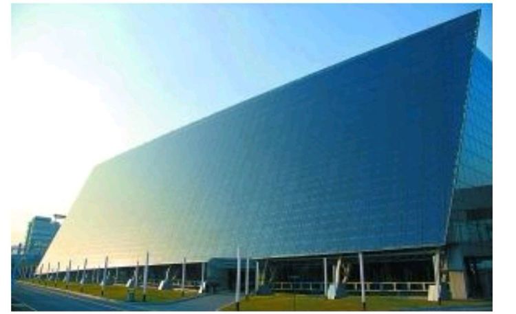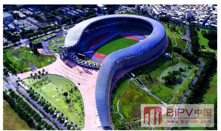 4)、2009年台湾高雄世运会主场馆螺旋造型的BIPV屋顶落成,总装机容量1MW,屋顶面积21000平方米,共辐射8844片BIPV模组,由台湾纳米龙科技设计研发和制造。