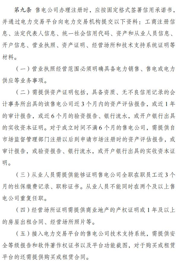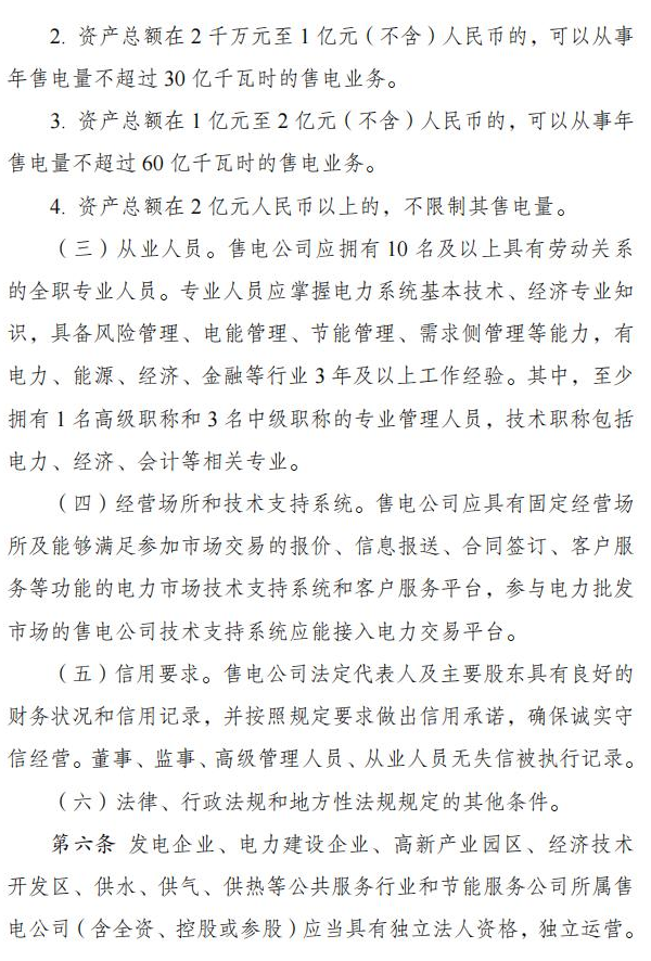 根据《办法》,注册售电公司资产总额不得低于 2 千万元人民币。资产总额在 2 千万元至 1 亿元(不含)人民币的,可以从事年售电量不超过 30 亿千瓦时的售电业务。资产总额在 1 亿元至 2 亿元(不含)人民币的,可以从事年售电量不超过 60 亿千瓦时的售电业务。资产总额在 2 亿元人民币以上的,不限制其售电量。