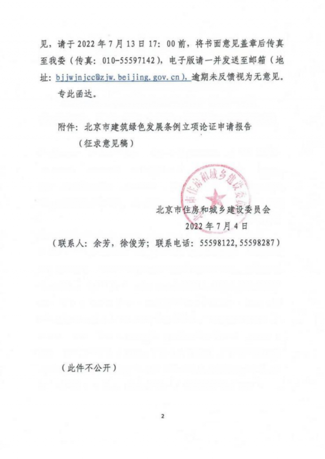 7月4日,北京住房和城乡建设委员会向北京市各相关部门印发关于征求《北京市建筑绿色开展条例立项论证申请报告(征求意见稿)》意见的函,就北京市2021年组织召开的北京市建筑绿色开展立法调研论证工作形创建项论证申请报告。