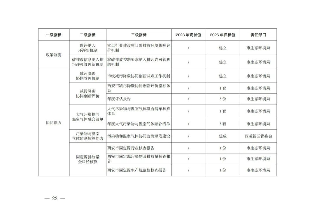 到2026年,形成一套减污降碳协同创新管理机制、模式路径和政策举措,构建“4+3+3+6”减污降碳协同创新“西安模式”,即召开能源、交通、工业、环境治理4个领域的减污降碳协同创新,在园区、企业、项目3个层次培育和遴选减污降碳协同创新标杆,出台减污降碳协同增效金融政策、碳评纳入环评新机制、碳排放信息纳入排污许可管理新机制3项减污降碳协同创新政策,提升市级层面试点工作机制创新、减污降碳协同创新评价指标体系创建、大气污染物与温室气体融合清单编制、污染物与温室气体监测核算、固定污染源排放量全口径核算、协同管理创新6种减污降碳协同管理和创新能力。投资约262亿元,推进66个减污降碳协同创新重点项目建设,确保全市非化石能源占能源消费比重达到22%以上,单位GDP能耗、主要污染物总量减排和单位GDP二氧化碳排放降低率完成省上下达目标。碳排放强度下降与生态环境质量改善协同推进取得明显成效,减污降碳协同度达到同类型城市领先水平,绿色低碳循环开展的经济体系初步形成。